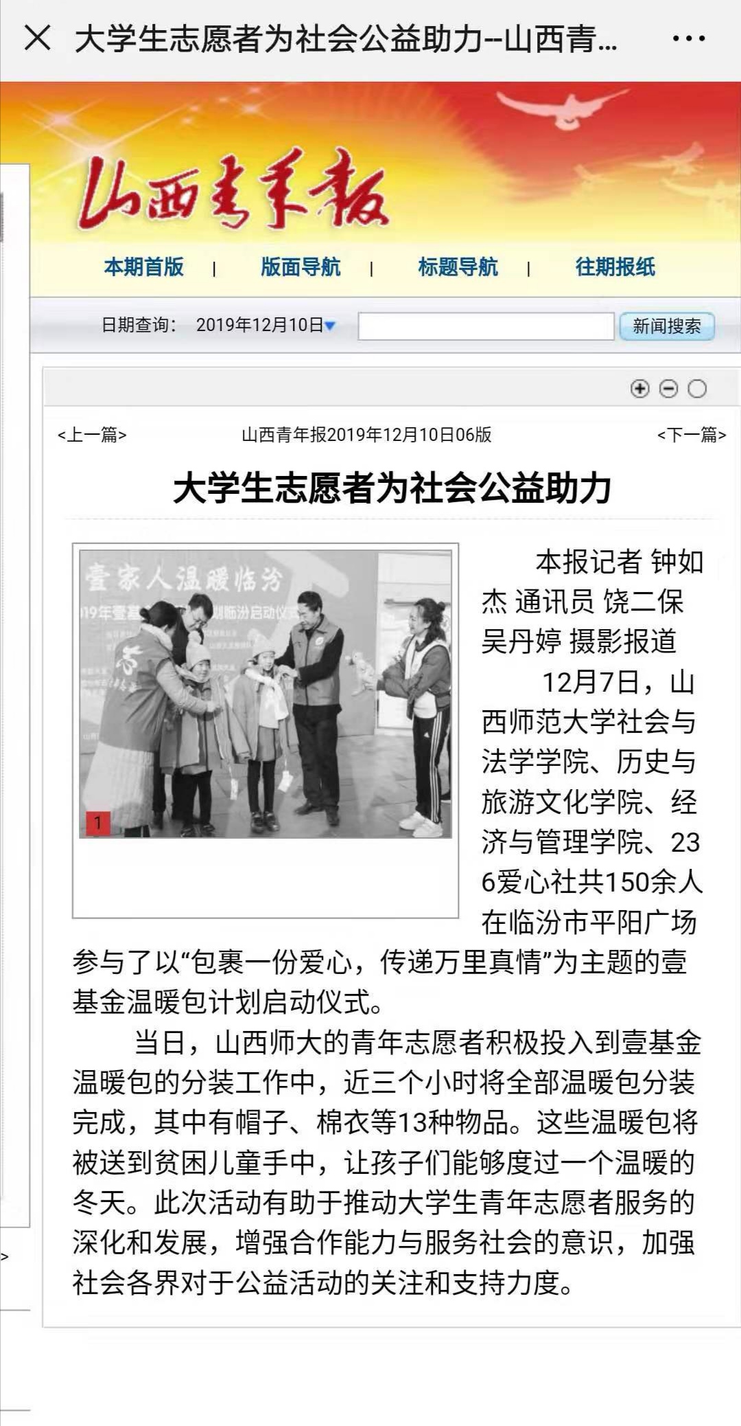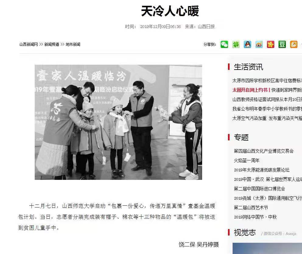 山西青年报 山西日报 报道公司青年志愿者协会参加壹基金温暖包分装仪式