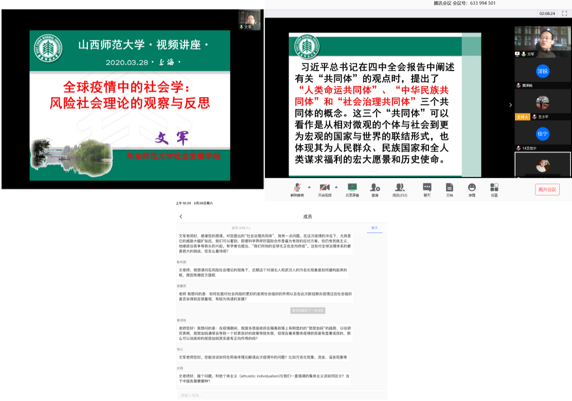 文军教授从风险社会理论视角阐述了新冠肺炎疫情暴发的社会学特征。他指出,新冠肺炎疫情风险的爆发是人类迈向风险社会历程中现代性极度膨胀的副产品,流动性、全球化、个体化等特征极大地加重了新冠肺炎的风险发生。他强调,完善应急管理体系及配套制度、重构社会信用体系和人际交往的信任关系对疫情防控极其重要。最后,文军教授阐释了十九届四中全会报告中的“共同体”概念,他说,人类命运共同体、中华民族共同体、社会治理共同体等三个共同体可以看作是从相对微观的个体与社会到更为宏观的国家与世界的联结,“人人有责”“人人尽责”“人人享有”的共同体治理内涵为疫情风险的防控指明了方向。报告结束后,文军教授与师生进行了线上互动,一一解释了同学们所提出的问题。
