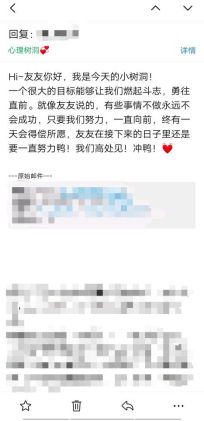 活动开始,首先由青年志愿者协会活动负责人给各班长发布QQ邮箱地址以及活动要求和目的。随后,各班负责人下发给公司员工,组织同学们积极参与,并通过该邮箱发送自己的烦恼困惑等。最后,活动负责人收到邮件后进行回复,解答同学们问题,并给予温馨回复,双方形成良好互动,进而缓解了同学们的心理压力。