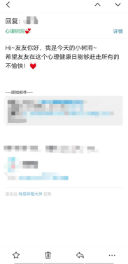 每年的5月25日,是老员工心理健康日,5.25是“我爱我”的谐音,寓意爱自己才能更好地爱他人。为促进同学心理健康,缓解压力,更好地认识自我,接纳自我,公司青年志愿者协会开展了以“树洞回音,温暖心灵”为主题的线上心理减压活动。