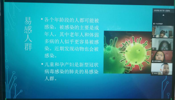 下午我采取了腾讯会议的授课方式,继续带领同学们学习和了解新冠病毒的危害以及一系列的防护措施。采取线上学习其实也是疫情期间既不停学又能保证自身健康的好办法。同学们跟随我进一步了解了“易感人群”以及预防措施等等新知识。虽然今天去线下的小高家转了好几趟车,但是收获还是颇多的。