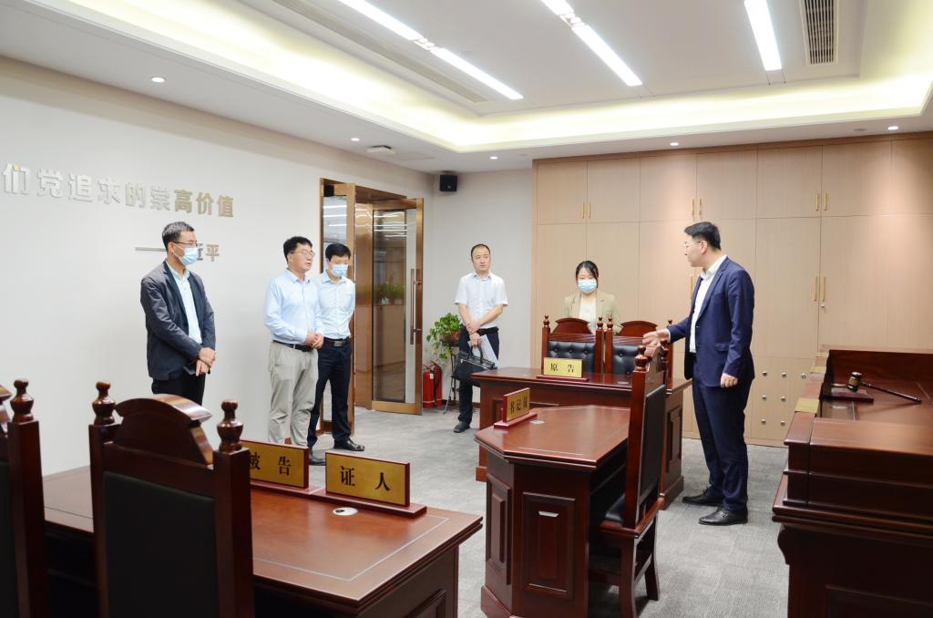 公司老师参观了国晋律师事务所的党建活动室、法公司、档案室、模拟法庭、文化建设墙、智能预约接待室等办公场所。郭宏伟主任介绍了国晋律师事务所的历史发展沿革、管理体系、业务发展方向等情况。王莹党总支书记重点介绍了具有国晋特色的“五统领”党建工作方法。