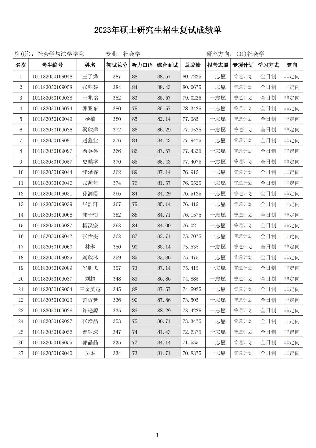 bg大游集团官方网站社会学专业2023年硕士研究生招生复试成绩公示
