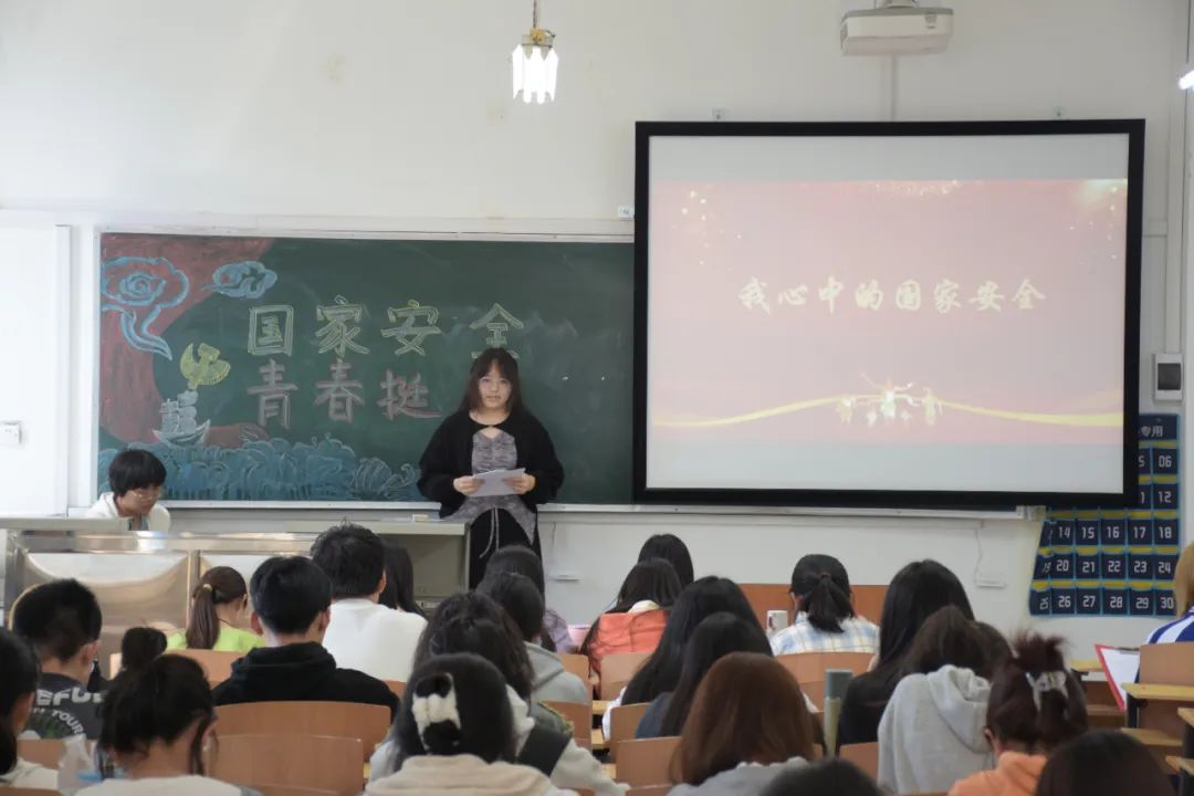 随后,郝天芷同学上台分享了她对于国家安全的理解,她用精炼的语言,清晰而坚定地表明了自己维护国家安全的决心和信心。会议最后,主持人带领参会人员宣读国家安全教育誓词,同学们目光坚毅,铿锵有力的声音展示出青年一代对于维护国家安全的坚定信念。