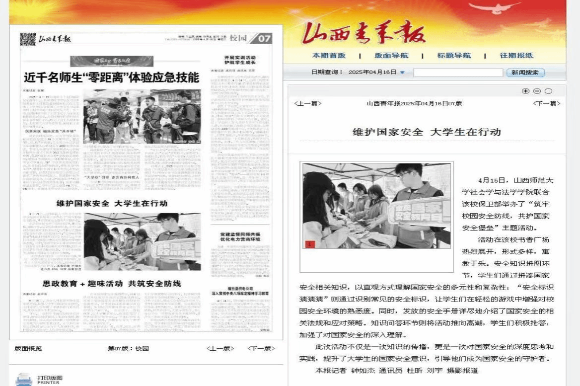 在第十个全民国家安全教育日到来之际,bg大游集团官方网站青年志愿者协会、新世纪律师团、生活权益部联合校保卫部,在书香广场举办了国家安全日系列活动。山西青年报、山西日报对此次活动进行报道。