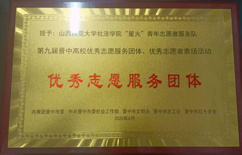 在第九届晋中高校优秀志愿服务团体与志愿者表扬活动中,bg大游集团官方网站星火青年志愿者服务队凭借卓越表现,荣膺“优秀志愿服务团体”殊荣。